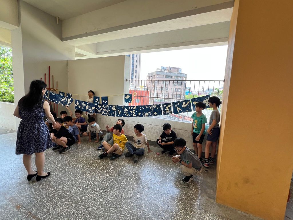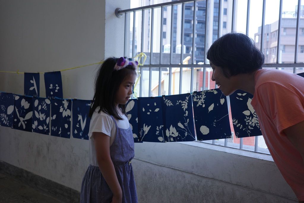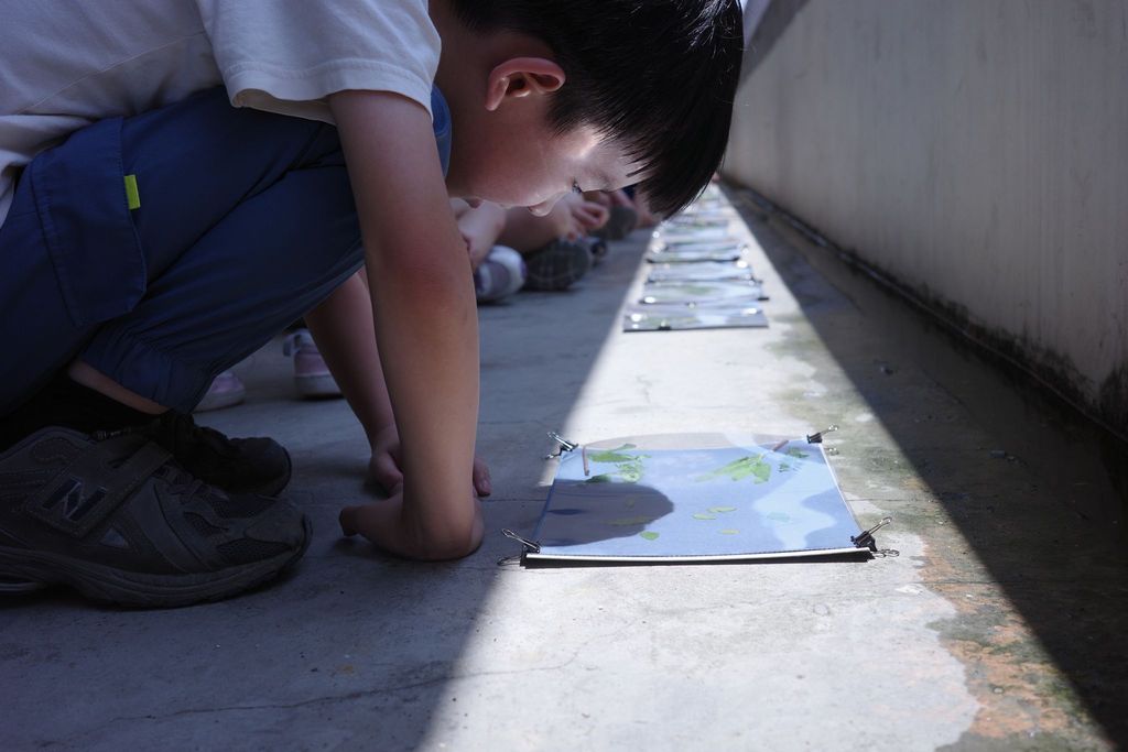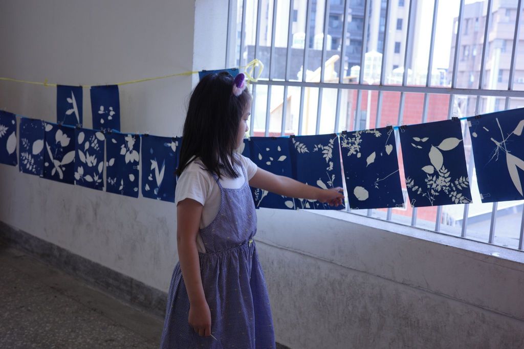 藍曬的製作是充滿變化的過程。陽光下,紙張的顏色逐漸轉深;隨著水洗輕輕搖晃,影像緩緩浮現出來。這段過程引發同學們豐富的反應——驚訝、好奇、興奮交織其間。