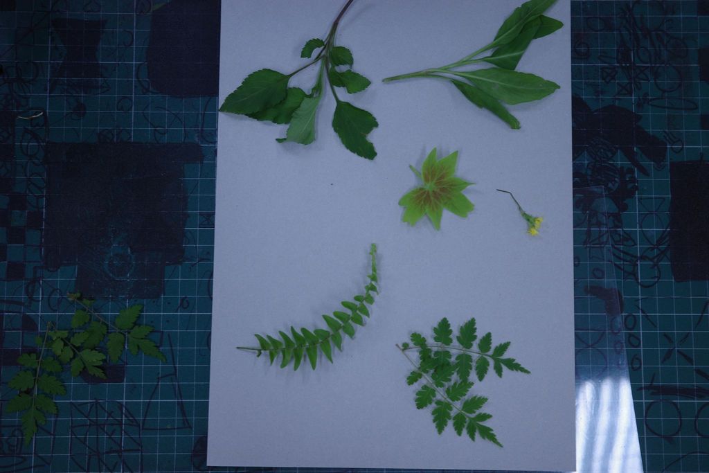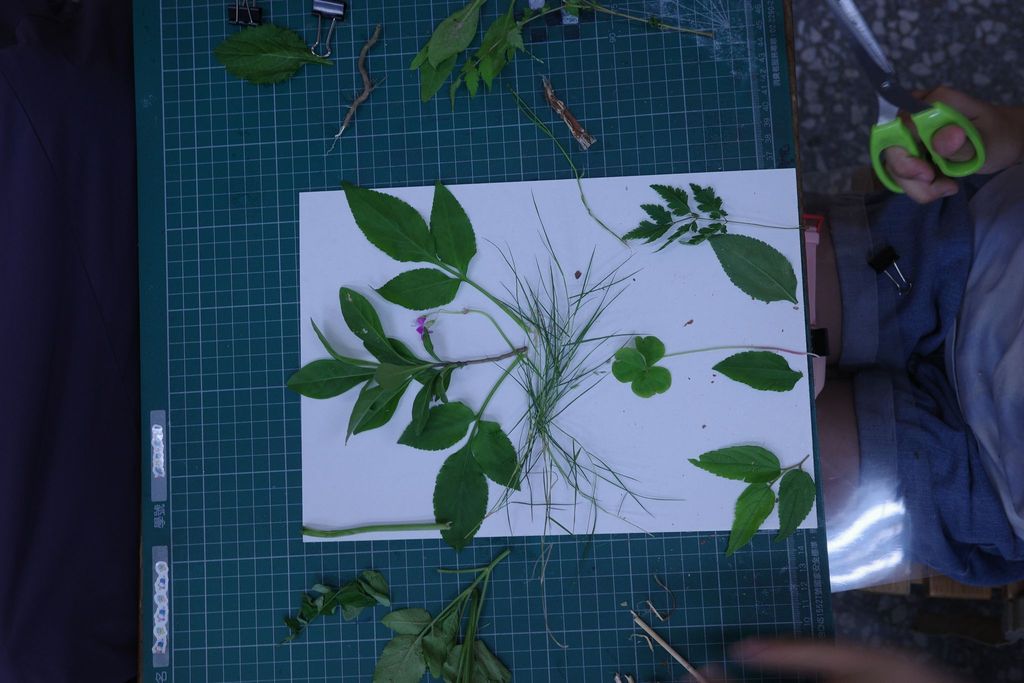 在採集植物的過程中,同學們透過雙手與雙眼細細地觀察——他們蹲下來,觸摸葉片的紋理,感受石頭、枝幹的粗糙與質地。植物被一一排放在感光紙上,創作即悄然展開。